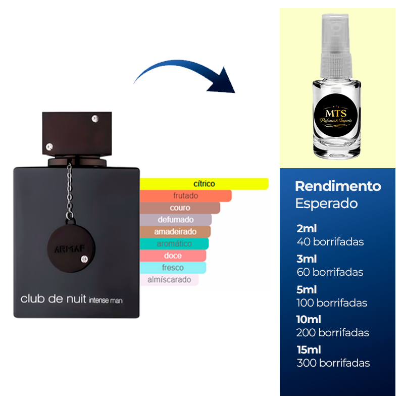 Club de Nuit Intense Man de Armaf é um perfume Amadeirado Especiado Masculino. Club de Nuit Intense Man foi lançado em 2015. As notas de topo são: Limão, Abacaxi, Bergamota, Groselha Preta e Maçã. As notas de coração são: Vidoeiro, Jasmim e Rosa. As notas de fundo são: Almíscar, mbar Cinzento, Patchouli e Baunilha.